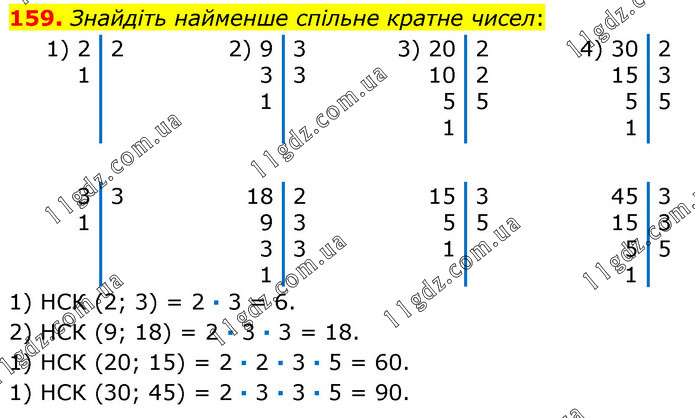 Знайдіть найменше спільне кратне чисел: 1) НСК (2; 3) = 2 · 3 = 6. 2) НСК (9; 18) = 2 · 3 · 3 = 18. 1) НСК (20; 15) = 2 · 2 · 3 · 5 = 60. 1) НСК (30; 45) = 2 · 3 · 3 · 5 = 90.