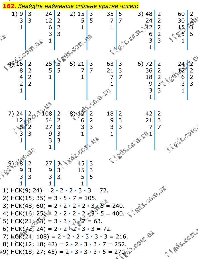 Знайдіть найменше спільне кратне чисел: 1) НСК(9; 24) = 2 · 2 · 2 · 3 · 3 = 72. 2) НСК(15; 35) = 3 · 5 · 7 = 105. 3) НСК(48; 60) = 2 · 2 · 2 · 2 · 3 · 5 = 240. 4) НСК(16; 25) = 2 · 2 · 2 · 2 · 5 · 5 = 400. 5) НСК(21; 63) = 3 · 3 · 3 · 7 = 63. 6) НСК(72; 24) = 2 · 2 · 2 · 3 · 3 = 72. 7) НСК(24; 108) = 2 · 2 · 2 · 3 · 3 · 3 = 216. 8) НСК(12; 18; 42) = 2 · 2 · 3 · 3 · 7 = 252. 9) НСК(18; 27; 45) = 2 · 3 · 3 · 3 · 5 = 270.