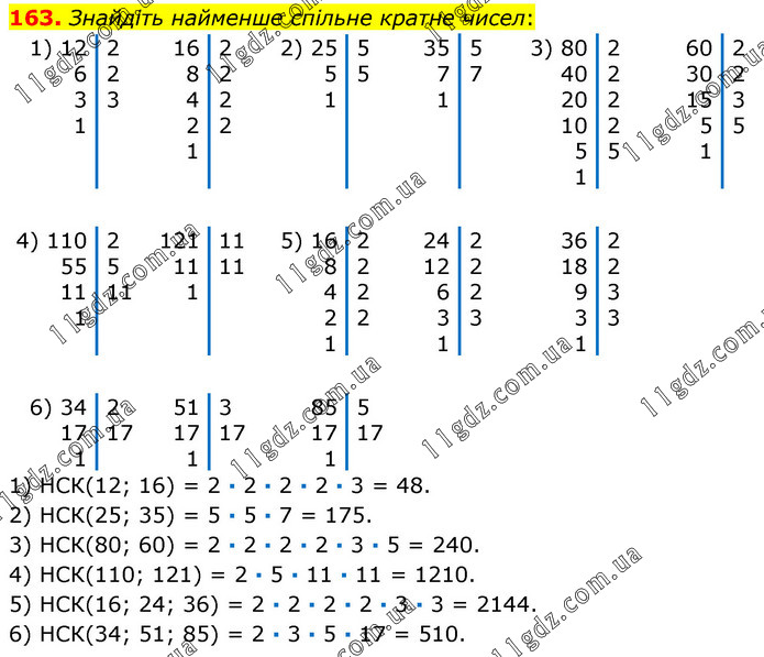 Знайдіть найменше спільне кратне чисел: 1) НСК(12; 16) = 2 · 2 · 2 · 2 · 3 = 48. 2) НСК(25; 35) = 5 · 5 · 7 = 175. 3) НСК(80; 60) = 2 · 2 · 2 · 2 · 3 · 5 = 240. 4) НСК(110; 121) = 2 · 5 · 11 · 11 = 1210. 5) НСК(16; 24; 36) = 2 · 2 · 2 · 2 · 3 · 3 = 2144. 6) НСК(34; 51; 85) = 2 · 3 · 5 · 17 = 510.