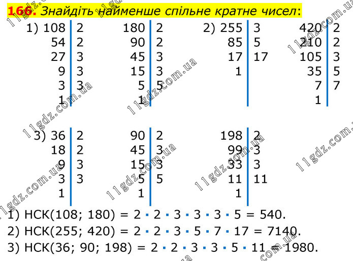 Знайдіть найменше спільне кратне чисел: 1) НСК(108; 180) = 2 · 2 · 3 · 3 · 3 · 5 = 540. 2) НСК(255; 420) = 2 · 2 · 3 · 5 · 7 · 17 = 7140. 3) НСК(36; 90; 198) = 2 · 2 · 3 · 3 · 5 · 11 = 1980.