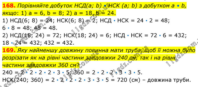 168. Порівняйте добуток НСД(а; b) • HCK (а; b) з добутком а • b, якщо: 1) а = 6, b = 8; 2) а = 18, b = 24. 1) НСД(6; 8) = 24; НСК(6; 8) = 2; НСД · НСК = 24 · 2 = 48; 6 · 8 = 48; 48 = 48. 2) НСД(18; 24) = 72; НСК(18; 24) = 6; НСД · НСК = 72 · 6 = 432; 18 · 24 = 432; 432 = 432. 169. Яку найменшу довжину повинна мати труба, щоб її можна було розрізати як на рівні частини завдовжки 240 см, так і на рівні частини завдовжки 360 см? 240 = 2 · 2 · 2 · 2 · 3 · 5; 360 = 2 · 2 · 2 · 3 · 3 · 5. НСК(240; 360) = 2 · 2 · 2 · 2 · 3 · 3 · 5 = 720 (см) – довжина труби.