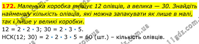Маленька коробка вміщує 12 олівців, а велика — 30. Знайдіть найменшу кількість олівців, які можна запакувати як лише в малі, так і лише у великі коробки. 12 = 2 · 2 · 3; 30 = 2 · 3 · 5. НСК(12; 30) = 2 · 2 · 3 · 5 = 60 (шт.) – кількість олівців.