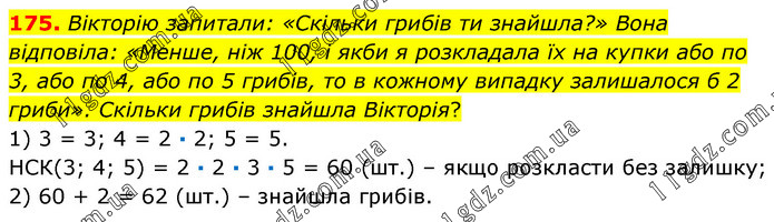 Вікторію запитали: «Скільки грибів ти знайшла?» Вона відповіла: «Менше, ніж 100, і якби я розкладала їх на купки або по 3, або по 4, або по 5 грибів, то в кожному випадку залишалося б 2 гриби». Скільки грибів знайшла Вікторія? 1) 3 = 3; 4 = 2 · 2; 5 = 5. НСК(3; 4; 5) = 2 · 2 · 3 · 5 = 60 (шт.) – якщо розкласти без залишку; 2) 60 + 2 = 62 (шт.) – знайшла грибів.