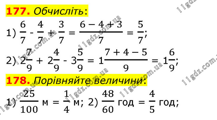 177. Обчисліть: 1) 6/7 - 4/7 + 3/7 = (6 - 4 + 3)/7 = 5/7; 2) 27/9 + 24/9 - 35/9 = 1(7 + 4 - 5)/9 = 16/9; 178. Порівняйте величини: 1) 25/100 м = 1/4 м; 2) 48/60 год = 4/5 год;