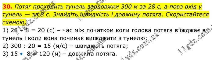 Потяг проходить тунель завдовжки 300 м за 28 с, а повз вхід у тунель — за 8 с. Знайдіть швидкість і довжину потяга. Скористайтеся схемою. 1) 28 – 8 = 20 (с) – час між початком коли голова потяга в’їжджає в тунель і коли вона починає виїжджати з тунелю; 2) 300 : 20 = 15 (м/с) – швидкість потяга; 3) 15 • 8 = 120 (м) – довжина потяга.