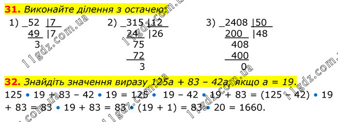 32. Знайдіть значення виразу 125а + 83 – 42а, якщо а = 19. 125 • 19 + 83 – 42 • 19 = 125 • 19 – 42 • 19 + 83 = (125 – 42) • 19 + 83 = 83 • 19 + 83 = 83 • (19 + 1) = 83 • 20 = 1660.