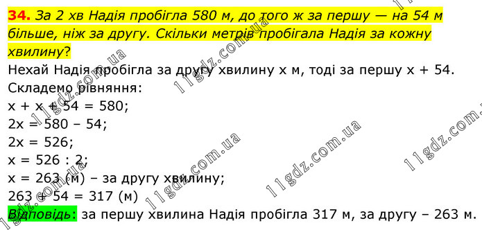 За 2 хв Надія пробігла 580 м, до того ж за першу — на 54 м більше, ніж за другу. Скільки метрів пробігала Надія за кожну хвилину? Нехай Надія пробігла за другу хвилину х м, тоді за першу х + 54. Складемо рівняння: х + х + 54 = 580; 2х = 580 – 54; 2х = 526; х = 526 : 2; х = 263 (м) – за другу хвилину; 263 + 54 = 317 (м) Відповідь: за першу хвилина Надія пробігла 317 м, за другу – 263 м.