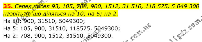 Серед чисел 93, 105, 708, 900, 1512, 31 510, 118 575, 5 049 300 назвіть ті, що діляться на 10; на 5; на 2. На 10: 900, 31510, 5049300; На 5: 105, 900, 31510, 118575, 5049300; На 2: 708, 900, 1512, 31510, 5049300.