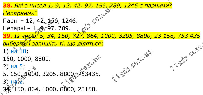 38. Які з чисел 1, 9, 12, 42, 97, 156, 789, 1246 є парними? Непарними? Парні – 12, 42, 156, 1246. Непарні – 1, 9, 97, 789. 39. Із чисел 5, 34, 150, 727, 864, 1000, 3205, 8800, 23 158, 753 435 виберіть і запишіть ті, що діляться: 1) на 10; 150, 1000, 8800. 2) на 5; 5, 150, 1000, 3205, 8800, 753435. 3) на 2. 34, 150, 864, 1000, 8800, 23158.