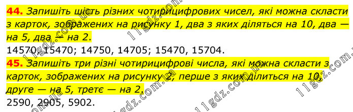 44. Запишіть шість різних чотирицифрових чисел, які можна скласти з карток, зображених на рисунку 1, два з яких діляться на 10, два — на 5, два — на 2. 14570, 15470; 14750, 14705; 15470, 15704. 45. Запишіть три різні чотирицифрові числа, які можна скласти з карток, зображених на рисунку 2, перше з яких ділиться на 10, друге — на 5, третє — на 2. 2590, 2905, 5902.
