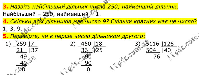 3. Назвіть найбільший дільник числа 250; найменший дільник. Найбільший – 250, найменший – 1. 4. Скільки всіх дільників має число 9? Скільки кратних має це число? 1, 3, 9. 5. Перевірте, чи є перше число дільником другого: