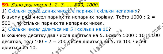 Дано ряд чисел 1, 2, 3, ..., 999, 1000. 1) Скільки серед даних чисел є парних і скільки непарних? В цьому ряді чисел парних та непарних порівну. Тобто 1000 : 2 = 500 – по стільки парних та непарних чисел. 2) Скільки чисел ділиться на 5 і скільки на 10? В кожному десятку два числа ділиться на 5. Всього 1000 : 10 = 100 десятків, тоді 100 • 2 = 200 чисел ділиться на 5, та 100 чисел ділиться на 10.