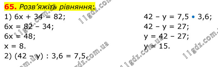 Розв’яжіть рівняння: 1) 6х + 34 = 82; 6х = 82 – 34; 6х = 48; х = 8. 2) (42 – у) : 3,6 = 7,5. 42 – у = 7,5 • 3,6; 42 – у = 27; у = 42 – 27; у = 15.
