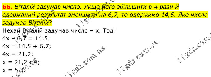 Віталій задумав число. Якщо його збільшити в 4 рази й одержаний результат зменшити на 6,7, то одержимо 14,5. Яке число задумав Віталій? Нехай Віталій задумав число – х. Тоді 4х – 6,7 = 14,5; 4х = 14,5 + 6,7; 4х = 21,2; х = 21,2 : 4; х = 5,3.