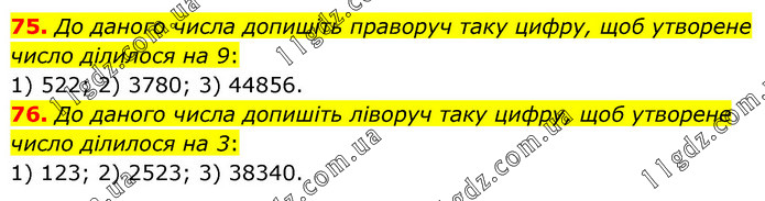 75. До даного числа допишіть праворуч таку цифру, щоб утворене число ділилося на 9: 1) 522; 2) 3780; 3) 44856. 76. До даного числа допишіть ліворуч таку цифру, щоб утворене число ділилося на 3: 1) 123; 2) 2523; 3) 38340.