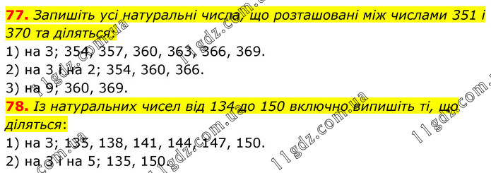 77. Запишіть усі натуральні числа, що розташовані між числами 351 і 370 та діляться: 1) на З; 354, 357, 360, 363, 366, 369. 2) на 3 і на 2; 354, 360, 366. 3) на 9; 360, 369. 78. Із натуральних чисел від 134 до 150 включно випишіть ті, що діляться: 1) на З; 135, 138, 141, 144, 147, 150. 2) на 3 і на 5; 135, 150.