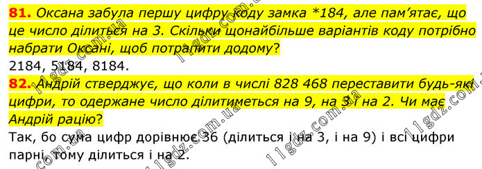 81. Оксана забула першу цифру коду замка *184, але пам’ятає, що це число ділиться на 3. Скільки щонайбільше варіантів коду потрібно набрати Оксані, щоб потрапити додому? 2184, 5184, 8184. 82. Андрій стверджує, що коли в числі 828 468 переставити будь-які цифри, то одержане число ділитиметься на 9, на З і на 2. Чи має Андрій рацію? Так, бо сума цифр дорівнює 36 (ділиться і на 3, і на 9) і всі цифри парні, тому ділиться і на 2.