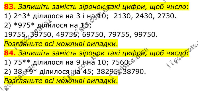 83. Запишіть замість зірочок такі цифри, щоб число: 1) 2*3* ділилося на 3 і на 10; 2130, 2430, 2730. 2) *975* ділилося на 15; 19755, 39750, 49755, 69750, 79755, 99750. Розгляньте всі можливі випадки. 84. Запишіть замість зірочок такі цифри, щоб число: 1) 75** ділилося на 9 і на 10; 7560. 2) 38 *9* ділилося на 45; 38295, 38790. Розгляньте всі можливі випадки.