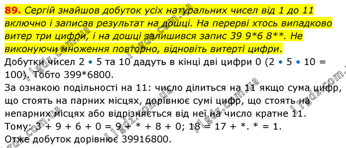 Сергій знайшов добуток усіх натуральних чисел від 1 до 11 включно і записав результат на дошці. На перерві хтось випадково витер три цифри, і на дошці залишився запис 39 9*6 8**. He виконуючи множення повторно, відновіть витерті цифри. Добутки чисел 2 • 5 та 10 дадуть в кінці дві цифри 0 (2 • 5 • 10 = 100). Тобто 399*6800. За ознакою подільності на 11: число ділиться на 11 якщо сума цифр, що стоять на парних місцях, дорівнює сумі цифр, що стоять на непарних місцях або відрізняється від неї на число кратне 11. Тому: 3 + 9 + 6 + 0 = 9 + * + 8 + 0; 18 = 17 + *. * = 1. Отже добуток дорівнює 39916800.
