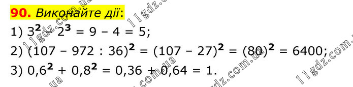 Виконайте дії: 1) З2 – 23 = 9 – 4 = 5; 2) (107 – 972 : 36)2 = (107 – 27)2 = (80)2 = 6400; 3) 0,62 + 0,82 = 0,36 + 0,64 = 1.