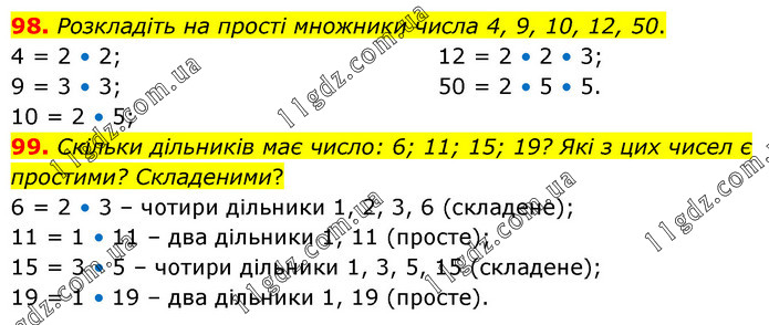 98. Розкладіть на прості множники числа 4, 9, 10, 12, 50. 4 = 2 • 2; 9 = 3 • 3; 10 = 2 • 5; 12 = 2 • 2 • 3; 50 = 2 • 5 • 5. 99. Скільки дільників має число: 6; 11; 15; 19? Які з цих чисел є простими? Складеними? 6 = 2 • 3 – чотири дільники 1, 2, 3, 6 (складене); 11 = 1 • 11 – два дільники 1, 11 (просте); 15 = 3 • 5 – чотири дільники 1, 3, 5, 15 (складене); 19 = 1 • 19 – два дільники 1, 19 (просте).