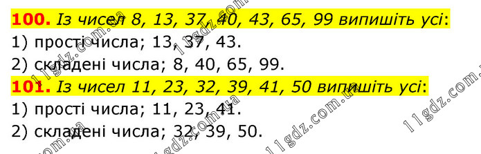 100. Із чисел 8, 13, 37, 40, 43, 65, 99 випишіть усі: 1) прості числа; 13, 37, 43. 2) складені числа; 8, 40, 65, 99. 101. Із чисел 11, 23, 32, 39, 41, 50 випишіть усі: 1) прості числа; 11, 23, 41. 2) складені числа; 32, 39, 50.