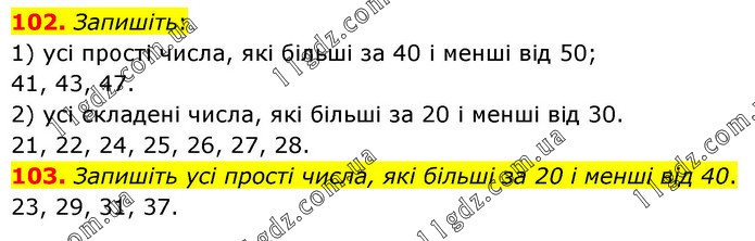 102. Запишіть: 1) усі прості числа, які більші за 40 і менші від 50; 41, 43, 47. 2) усі складені числа, які більші за 20 і менші від 30. 21, 22, 24, 25, 26, 27, 28. 103. Запишіть усі прості числа, які більші за 20 і менші від 40. 23, 29, 31, 37.