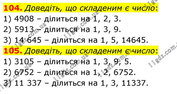 104. Доведіть, що складеним є число: 1) 4908 – ділиться на 1, 2, 3. 2) 5913 – ділиться на 1, 3, 9. 3) 14 645 – ділиться на 1, 5, 14645. 105. Доведіть, що складеним є число: 1) 3105 – ділиться на 1, 3, 9, 5. 2) 6752 – ділиться на 1, 2, 6752. 3) 11 337 – ділиться на 1, 3, 11337.