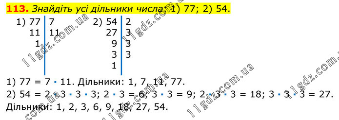 Знайдіть усі дільники числа: 1) 77; 2) 54. 1) 77 = 7 · 11. Дільники: 1, 7, 11, 77. 2) 54 = 2 · 3 · 3 · 3; 2 · 3 = 6; 3 · 3 = 9; 2 · 3 · 3 = 18; 3 · 3 · 3 = 27. Дільники: 1, 2, 3, 6, 9, 18, 27, 54.