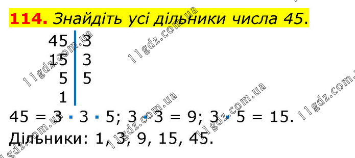 Знайдіть усі дільники числа 45. 45 = 3 · 3 · 5; 3 · 3 = 9; 3 · 5 = 15. Дільники: 1, 3, 9, 15, 45.