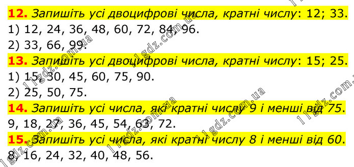 12. Запишіть усі двоцифрові числа, кратні числу: 12; 33. 1) 12, 24, 36, 48, 60, 72, 84, 96. 2) 33, 66, 99. 13. Запишіть усі двоцифрові числа, кратні числу: 15; 25. 1) 15, 30, 45, 60, 75, 90. 2) 25, 50, 75. 14. Запишіть усі числа, які кратні числу 9 і менші від 75. 9, 18, 27, 36, 45, 54, 63, 72. 15. Запишіть усі числа, які кратні числу 8 і менші від 60. 8, 16, 24, 32, 40, 48, 56.