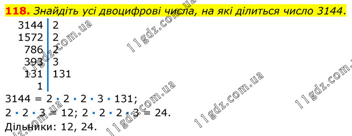 Знайдіть усі двоцифрові числа, на які ділиться число 3144. 3144 = 2 · 2 · 2 · 3 · 131; 2 · 2 · 3 = 12; 2 · 2 · 2 · 3 = 24. Дільники: 12, 24.