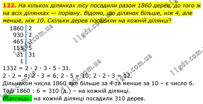 На кількох ділянках лісу посадили разом 1860 дерев, до того ж на всіх ділянках — порівну. Відомо, що ділянок більше, ніж 4, але менше, ніж 10. Скільки дерев посадили на кожній ділянці? 1332 = 2 · 2 · 3 · 5 · 31. 2 · 2 = 4; 2 · 3 = 6; 2 · 5 = 10; 2 · 2 · 3 = 12. Дільником числа 1860 яке більше за 4 та менше за 10 – є число 6. Тоді 1860 : 6 = 310 (д.) – на кожній ділянці. Відповідь: на кожній ділянці посадили 310 дерев.