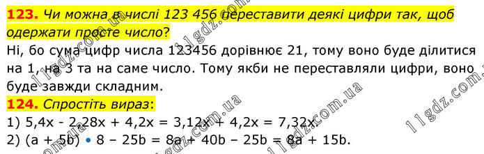 123. Чи можна в числі 123 456 переставити деякі цифри так, щоб одержати просте число? Ні, бо сума цифр числа 123456 дорівнює 21, тому воно буде ділитися на 1, на 3 та на саме число. Тому якби не переставляли цифри, воно буде завжди складним. 124. Спростіть вираз: 1) 5,4х - 2,28х + 4,2х = 3,12х + 4,2х = 7,32х. 2) (а + 5b) • 8 – 25b = 8а + 40b – 25b = 8a + 15b.