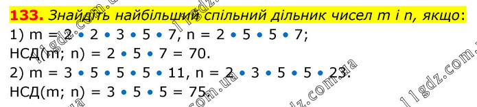 Знайдіть найбільший спільний дільник чисел m і n, якщо: 1) m = 2 • 2 • 3 • 5 • 7, n = 2 • 5 • 5 • 7; НСД(m; n) = 2 • 5 • 7 = 70. 2) m = 3 • 5 • 5 • 5 • 11, n = 2 • 3 • 5 • 5 • 23. НСД(m; n) = 3 • 5 • 5 = 75.