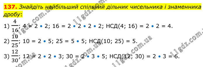 Знайдіть найбільший спільний дільник чисельника і знаменника дробу: 1) 4/16; 4 = 2 • 2; 16 = 2 • 2 • 2 • 2; НСД(4; 16) = 2 • 2 = 4. 2) 10/25; 10 = 2 • 5; 25 = 5 • 5; НСД(10; 25) = 5. 3) 12/30; 12 = 2 • 2 • 3; 30 = 2 • 3 • 5; НСД(12; 30) = 2 • 3 = 6.