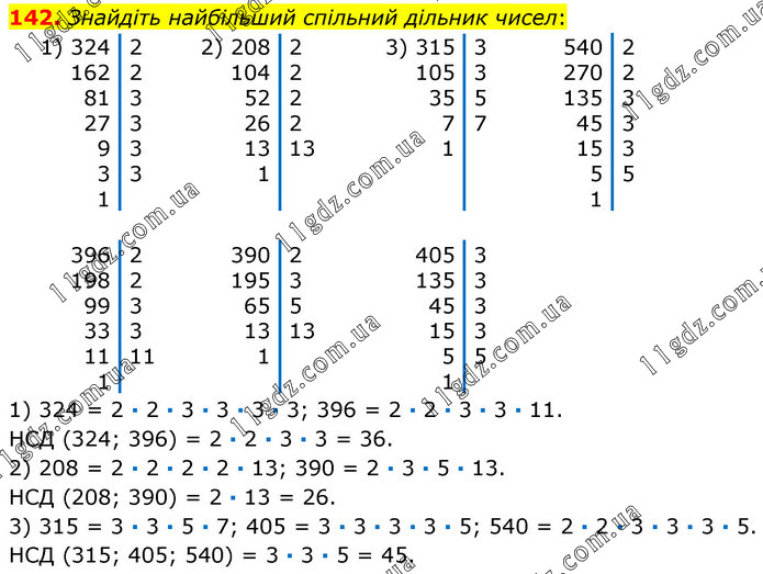 1) 324 = 2 · 2 · 3 · 3 · 3 · 3; 396 = 2 · 2 · 3 · 3 · 11. НСД (324; 396) = 2 · 2 · 3 · 3 = 36. 2) 208 = 2 · 2 · 2 · 2 · 13; 390 = 2 · 3 · 5 · 13. НСД (208; 390) = 2 · 13 = 26. 3) 315 = 3 · 3 · 5 · 7; 405 = 3 · 3 · 3 · 3 · 5; 540 = 2 · 2 · 3 · 3 · 3 · 5. НСД (315; 405; 540) = 3 · 3 · 5 = 45.