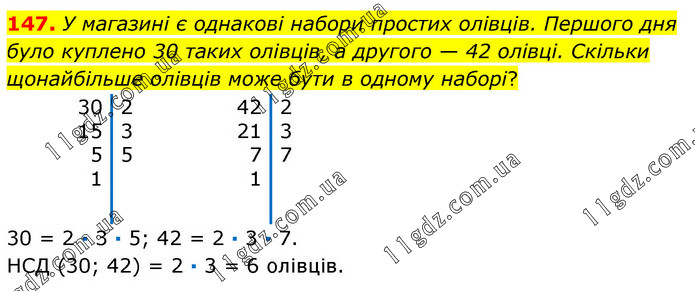 У магазині є однакові набори простих олівців. Першого дня було куплено 30 таких олівців, а другого — 42 олівці. Скільки щонайбільше олівців може бути в одному наборі? 30 = 2 · 3 · 5; 42 = 2 · 3 · 7. НСД (30; 42) = 2 · 3 = 6 олівців.