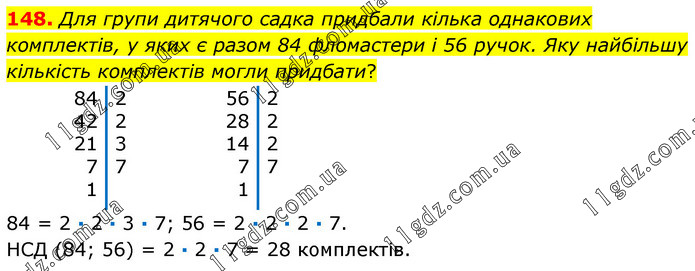 Для групи дитячого садка придбали кілька однакових комплектів, у яких є разом 84 фломастери і 56 ручок. Яку найбільшу кількість комплектів могли придбати? 84 = 2 · 2 · 3 · 7; 56 = 2 · 2 · 2 · 7. НСД (84; 56) = 2 · 2 · 7 = 28 комплектів.