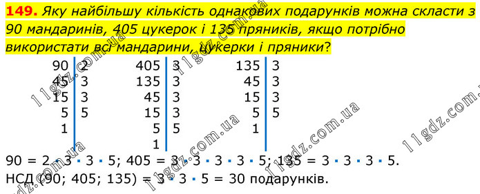 Яку найбільшу кількість однакових подарунків можна скласти з 90 мандаринів, 405 цукерок і 135 пряників, якщо потрібно використати всі мандарини, цукерки і пряники? 90 = 2 · 3 · 3 · 5; 405 = 3 · 3 · 3 · 3 · 5; 135 = 3 · 3 · 3 · 5. НСД (90; 405; 135) = 3 · 3 · 5 = 30 подарунків.