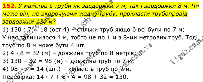 У майстра є труби як завдовжки 7 м, так і завдовжки 8 м. Чи може він, не вкорочуючи жодну трубу, прокласти трубопровід завдовжки 130 м? 1) 130 : 7 = 18 (ост.4) – стільки труб якщо б всі були по 7 м; У нас залишилося 4 м, тобто це по 1 м з 8-ми метрових труб. Тоді труб по 8 м може бути 4 шт. 2) 4 · 8 = 32 (м) – довжина труб по 8 метрів; 3) 130 – 32 = 98 (м) – довжина труб по 7 м; 4) 98 : 7 = 14 (шт.) – кількість труб по 7 м. Перевірка: 14 · 7 + 8 · 4 = 98 + 32 = 130.