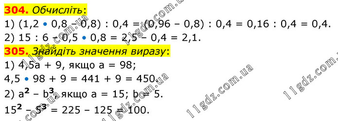 304. Обчисліть: 1) (1,2 • 0,8 – 0,8) : 0,4 = (0,96 – 0,8) : 0,4 = 0,16 : 0,4 = 0,4. 2) 15 : 6 – 0,5 • 0,8 = 2,5 – 0,4 = 2,1. 305. Знайдіть значення виразу: 1) 4,5а + 9, якщо а = 98; 4,5 • 98 + 9 = 441 + 9 = 450. 2) а2 – b3, якщо а = 15; b = 5. 152 – 53 = 225 – 125 = 100.