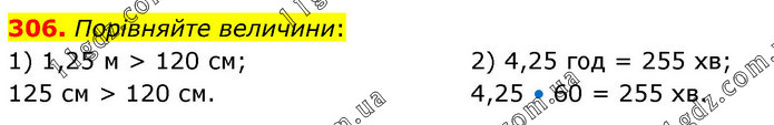 Порівняйте величини: 1) 1,25 м > 120 см; 125 см > 120 см. 2) 4,25 год = 255 хв; 4,25 • 60 = 255 хв.