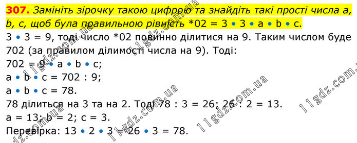 Замініть зірочку такою цифрою та знайдіть такі прості числа а, b, с, щоб була правильною рівність *02 = 3 • 3 • а • b • с. 3 • 3 = 9, тоді число *02 повинно ділитися на 9. Таким числом буде 702 (за правилом ділимості числа на 9). Тоді: 702 = 9 • a • b • c; a • b • c = 702 : 9; a • b • c = 78. 78 ділиться на 3 та на 2. Тоді 78 : 3 = 26; 26 : 2 = 13. а = 13; b = 2; c = 3. Перевірка: 13 • 2 • 3 = 26 • 3 = 78.