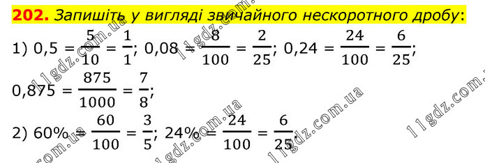 Запишіть у вигляді звичайного нескоротного дробу: 1) 0,5 = 5/10 = 1/1; 0,08 = 8/100 = 2/25; 0,24 = 24/100 = 6/25; 0,875 = 875/1000 = 7/8; 2) 60% = 60/100 = 3/5; 24% = 24/100 = 6/25.