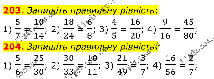 203. Запишіть правильну рівність: 1) 5/7 = 10/14; 2) 18/24 = 6/8; 3) 4/5 = 16/20; 4) 9/16 = 45/80; 204. Запишіть правильну рівність: 1) 5/6 = 25/30; 2) 30/33 = 10/11; 3) 21/49 = 3/7; 4) 16/56 = 2/7;
