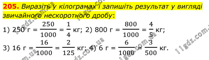 205. Виразіть у кілограмах і запишіть результат у вигляді звичайного нескоротного дробу: 1) 250 г = 250/1000 = 1/4 кг; 2) 800 г = 800/1000 = 4/5 кг; 3) 16 г = 16/1000 = 2/125 кг; 4) 6 г = 6/1000 = 3/500 кг.