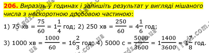 Виразіть у годинах і запишіть результат у вигляді мішаного числа з нескоротною дробовою частиною: 1) 75 хв = 75/60 = 11/4 год; 2) 250 хв = 250/60 = 41/6 год; 3) 1000 хв = 1000/60 = 162/3 год; 4) 5000 с = 5000/3600 = 11400/3600 = 17/8 год.