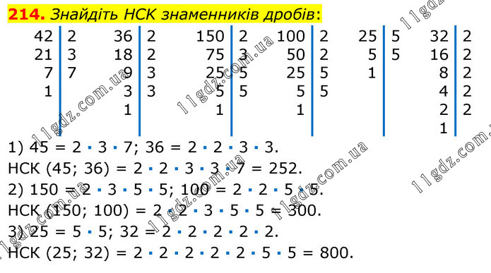 1) 45 = 2 · 3 · 7; 36 = 2 · 2 · 3 · 3. НСК (45; 36) = 2 · 2 · 3 · 3 · 7 = 252. 2) 150 = 2 · 3 · 5 · 5; 100 = 2 · 2 · 5 · 5. НСК (150; 100) = 2 · 2 · 3 · 5 · 5 = 300. 3) 25 = 5 · 5; 32 = 2 · 2 · 2 · 2 · 2. НСК (25; 32) = 2 · 2 · 2 · 2 · 2 · 5 · 5 = 800.