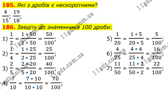 185. Які з дробів є нескоротними? 4/15; 19/18; 186. Зведіть до знаменника 100 дроби: 1) 1/2 = (1 • 50)/(2 • 50) = 50/100; 2) 1/4 = (1 • 25)/(2 • 25) = 25/100; 3) 2/5 = (2 • 20)/(5 • 20) = 40/100; 4) 7/10 = (7 • 10)/(10 • 10) = 70/100; 5) 1/20 = (1 • 5)/(20 • 5) = 5/100; 6) 4/25 = (4 • 4)/(25 • 4) = 16/100; 7) 11/50 = (11 • 2)/(50 • 2) = 22/100;